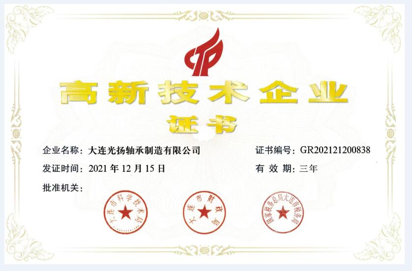 大連光揚軸承制造有限公司順利通過“高新技術企業”復審認定,并收到了大連市科學技術局、大連市財政局、國家稅務總局大連市稅務局聯合頒發的《高新技術企業證書》。